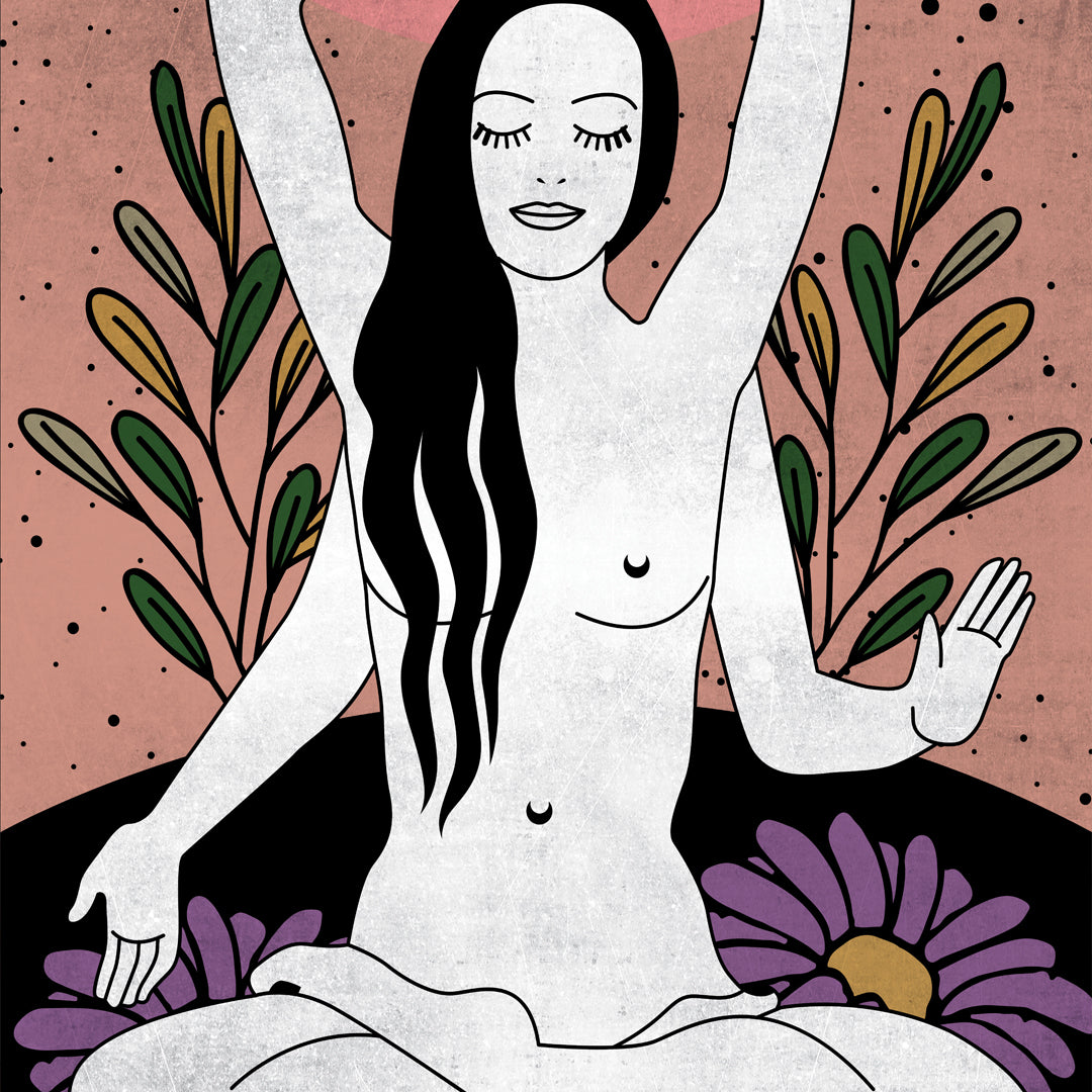 This beautiful, peaceful design by Karla depicts Devī basking in her creation, contemplating the four goals of human life: dharma, kāma, artha, and moksha.