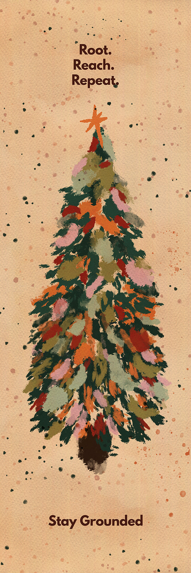 A festive yoga mat featuring a vibrant Christmas tree design with the grounding mantra "Root. Reach. Repeat. Stay Grounded." Perfect for bringing holiday cheer to your practice while staying centered and connected.